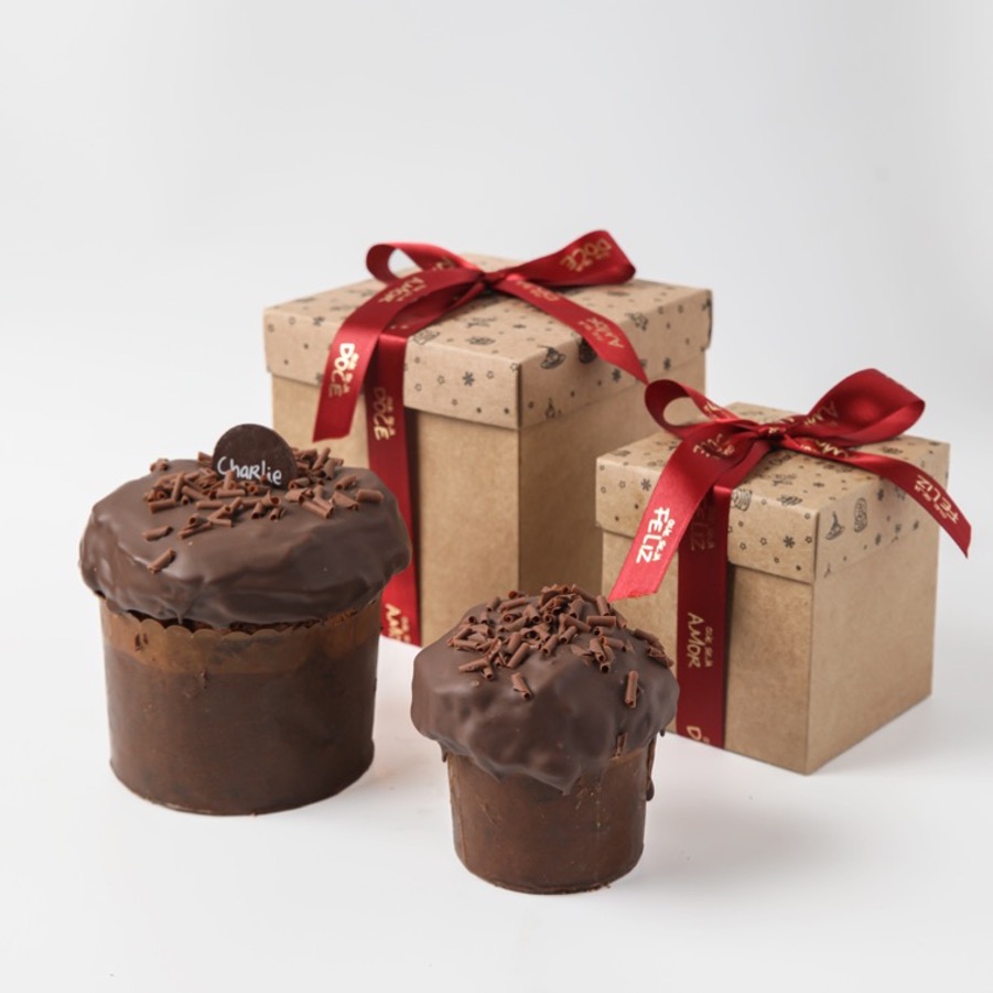 Elaborado com massa de brownie especialmente assado para versão chocotone e recheado com ganache de chocolate meio amargo